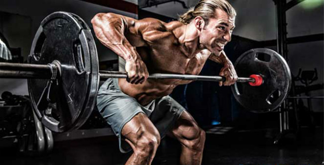 Взять гантели, ноги немного согнуть в коленях, спину прогнуть и наклонить вниз на 90⁰.