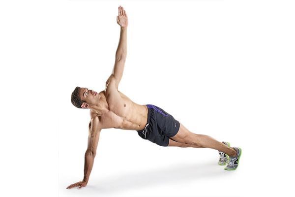Поворачивай корпус в разные стороны и при этом поднимай свободную руку вверх. Мышцы будут активно работать не только от самого упражнения, но и для сохранения устойчивости позиции.