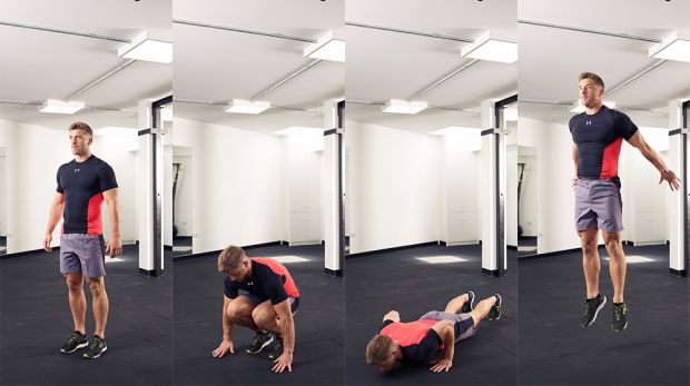 Нужно встать прямо, после чего присесть так, чтобы ладони коснулись напольного покрытия. Колени нужно прижать к груди. С помощью прыжка сделай планку, а потом отжимания в характерной для них позиции. Далее снова нужно подтянуть ноги к груди, подпрыгнуть и встать в исходное положение.