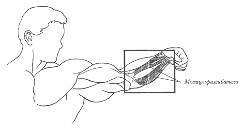 (2) Удерживая руки неподвижно, немного разогните пальцы и дайте штанге скатиться вниз, к фалангам пальцев. Затем согните пальцы, обхватите гриф штанги и поднимите ее вверх и назад так далеко, как только можете, напрягая мышцы предплечья. Следите за тем, чтобы во время упражнения двигались только запястья.