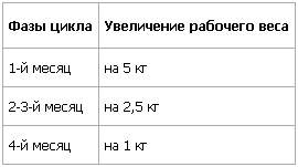Очень важно правильно спланировать увеличение весов в течение цикла. Не следует слишком сильно и резко увеличивать нагрузку, однако и затягивать с ростом рабочих весов не стоит (см. таблицу 4).