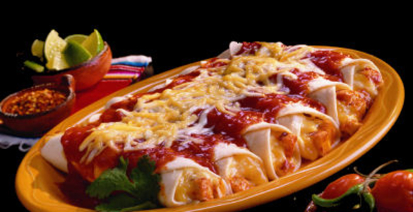 Энчилада - тортилья, покрытая соусом моле, тертым сыром с жареным луком и сметаной.