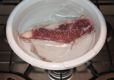 Теперь перейдем к разморозке стейка, если ты достал его из морозилки (а скорей всего так и есть). Делать это необходимо в холодной воде. В идеале мясо желательно размораживать, оставив его в основном отделении холодильника - на это у тебя уйдет приблизительно день. Но если тебе нужно ускорить процесс, тогда возьми стейк, не вынимая его из вакуумной упаковки, и положи в холодную воду. Так на его разморозку уйдет всего час.