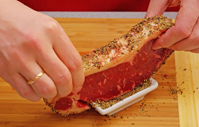 Для этого полностью обваляй мясо в перце среднего помола. Если таковой на твоей кухне отсутствует, просто поперчи стейк со всех сторон из обычной перцовой мельницы. Также ты можешь посыпать свой стейк перцем уже после жарки - принципиальных различий во вкусовых качествах ты не увидишь.