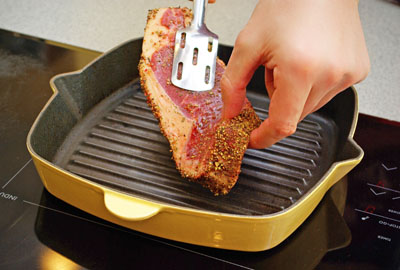 Не забывай, что сковороду надо хорошенько прогреть, и только потом класть на нее стейк.