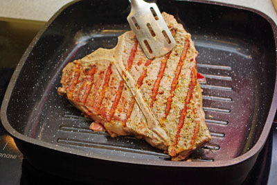 Чтобы ситуация с дымом не повторилась, стейк Ти-бон рекомендуется жарить без капли масла на многослойной алюминиевой сковороде-гриль, которая обладает антипригарным керамическим покрытием. Этот вариант считается идеальным, если тебе предстоит жарка мяса в домашних условиях.