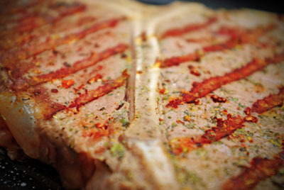 Тут уже можешь не скупиться - переборщить в этом деле ты явно не сможешь. Как соль, так и травы можно легонько втереть в мясо ладонью прихлопывающими и поглаживающими движениями. Конечно же, обработать специями необходимо обе поверхности стейков.