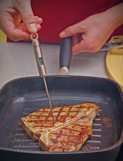 В идеале для точного определения момента готовности стейка используют кулинарный термометр. Но такая вещь водится далеко не в каждом доме, да и нужен термометр только на начальных порах, чтобы привыкнуть к принципу работы новой плиты или сковородки. Приготовив пару стейков, ты безо всякой помощи начнешь чувствовать, как долго нужно жарить мясо.