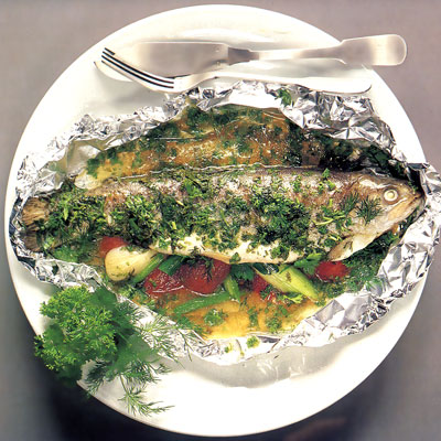 Сначала едят верхнюю половину. Затем ножом и вилкой отделяют хребет и голову, кладут их на край тарелки, после чего можно есть другую половину рыбы.