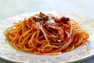 Взяв вилку в руку, которой вы обычно пишете, а ложку в другую руку, зачерпните не слишком полную ложку спагетти, прижимая зубцы вилки почти под прямым углом к центру ложки. Крутите вилку, не отрывая ее от ложки, и подносите последнюю ко рту, пока не почувствуете, что можно ложку убрать и съесть спагетти с вилки. Потренировавшись, вы научитесь есть спагетти без ложки — это и отличает эксперта от новичка!