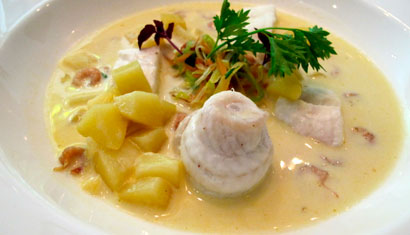 Суп готовится из копченой пикши, картофеля, лука и сливок.