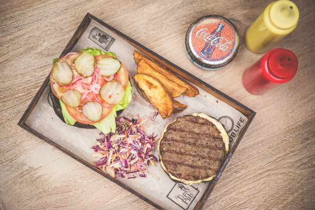 Из еды – бургеры. Более 10 позиций. Шеф повар – Картошкин Александр, в прошлом шеф-повар «Шотландской Клетки» и ресторана гостиницы «Золотое Кольцо», обещает использовать фарш только из охлажденного праймового мяса.