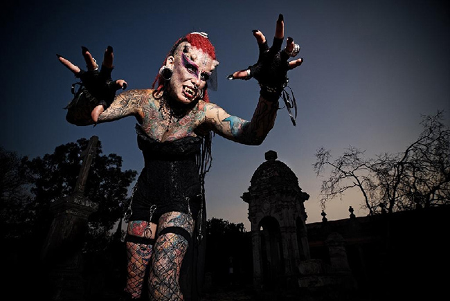 Когда-то мексиканка Мария Хосе была совершенно обычной женщиной и даже родила четверых детей, но сегодня ее внешность, без преувеличений, повергает в шок. 90% тела Кристерны покрыты татуировками; кроме того, она может похвастать огромным количеством пирсинга, устрашающими подкожными имплантами и зубами странной формы. Все это делает Марию Хосе максимально похожей на вампира - уверены, вряд ли кто-то захотел бы повстречать Кристерну в сумерках.