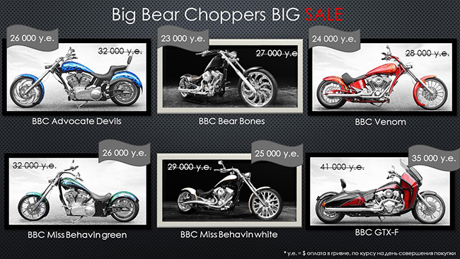 Любителей чопперов порадуют скидки на модельный ряд известного американского бренда - Big Bear Choppers. Каждый мотоцикл – это сочетание уникального дизайна, всегда привлекающего внимание к байку и его владельцу, надежности и мощи. Большинство деталей и аксессуаров для ВВС производятся непосредственно на фабрике, поэтому владельцы гарантируют их неповторимость и эксклюзивность. Очень часто байкер может «подгонять» мотоцикл соответственно своим предпочтениям, самостоятельно меняя его характеристики. На сайте можно выбрать как агрессивную мужскую модель (BBC Advocate Devil`s, BBC Bear Bones и др.), так и легкую изящную, которая подойдет для женщин и людей небольшого роста (BBC Miss Behavin).