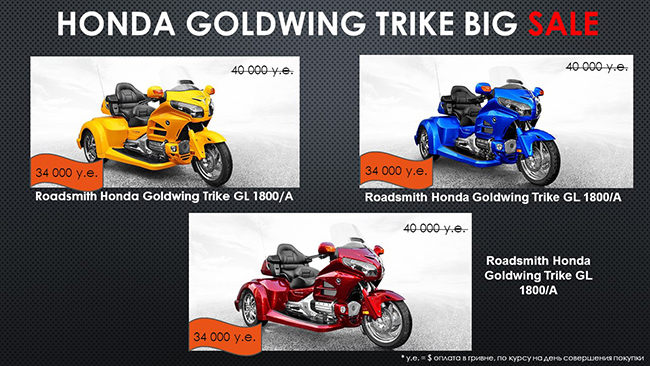 Трайк Honda замечательно подойдет для байкеров-новичков. Его особенность – независимая подвеска задних колес. Она помогает обеспечить лучшее сцепление с дорогой и делает ход байка более мягким. Мотоцикл такого типа сравнительно небольшой, легкий в управлении, безопасный, а также достаточно вместительный. В наличии одна модель трех разных расцветок.