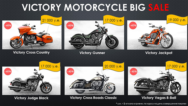 Но самая грандиозная скидка ожидает вас при покупке мотоцикла Victory -40%! Поторопитесь, ведь совсем недавно компания объявила о прекращении выпуска этих байков. Хотя аксессуары и комплектующие будут производить в течение еще 10-ти лет. Байки этого бренда можно описать всего в 2-х словах: минимализм и классика. А именно: большое количество хромированных деталей, минимум пластика и крутой дизайн. У некоторых моделей последний был разработан родоначальником кастомайзинга – Арленом Нессом.