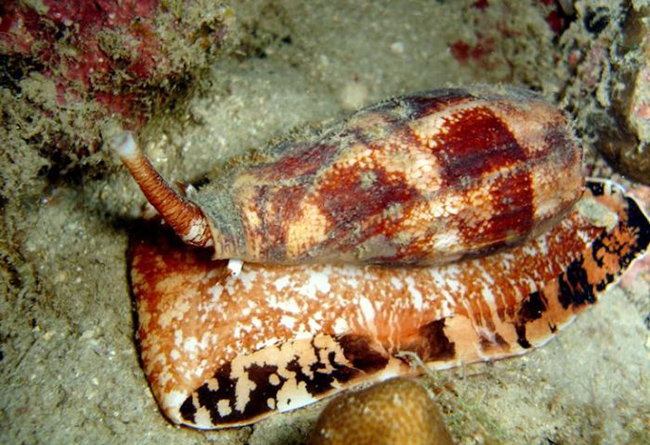 Среди улиток тоже есть хищник, который носит название конус. У него насыщенный и привлекательный окрас. Нередко люди берут в руки красивую улитку, не подозревая о большой опасности.