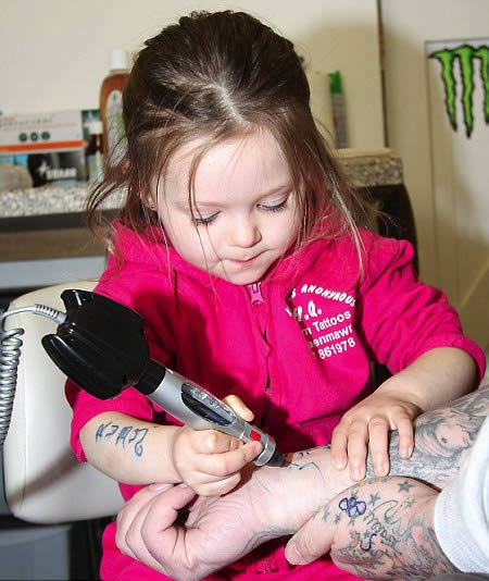 Этой девочке, которую вы видите на фото, всего четыре года. Да-да, и в этом возрасте она уже считается профессиональным тату-мастером. В то время, как ее товарищи играют в песочнице, девочка обучается мастерству татуировки. В общем, несколько странное увлечение для маленькой девочки, но родители не против. Хотя, может, в будущем это самый известный тату мастер мира.
