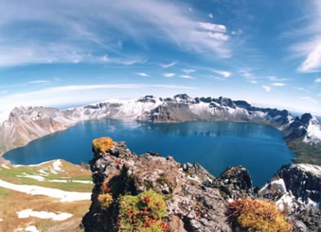 Интереснейшее озеро, которое получило название "Небесное", находится на границе Китая и Северной Кореи. Озеро расположено в кальдере, жерле вулкана, и занимает площадь до 10 квадратных километров. Это чрезвычайно красивое озеро, которое покрыто льдом с октября по июнь. Местные жители считают, что в озере живет неведомое чудище, подобно чудовищу озера Лох-Несс.