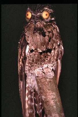 Эта птица - родственник козодоя, и ее название является производным от крика, который издает путуу ночью. Птица известна своей способностью маскироваться, однако если птица открывает глаза, вся маскировка пропадает зря. Почему? Ну, посмотрите на фотографию, и станет понятно. Кстати, эта птица насекомоядна, и как все предыдущие описанные животные, абсолютно безопасна для человека.
