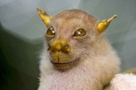 Эта летучая мышь не пугает, просто она довольно странная, как это можно видеть на фото. Точнее, не сама мышь странная, ведет-то она себя так же, как и все другие летучие мыши. Трубконосая летучая мышь имеет весьма странный внешний вид. Кстати, на фото не очень хорошо это видно, но глаза у мыши - ярко-оранжевые, так что можете дополнить внешний вид "мышки" оранжевым взглядом. Питается это животное фруктами, плюс ест насекомых.