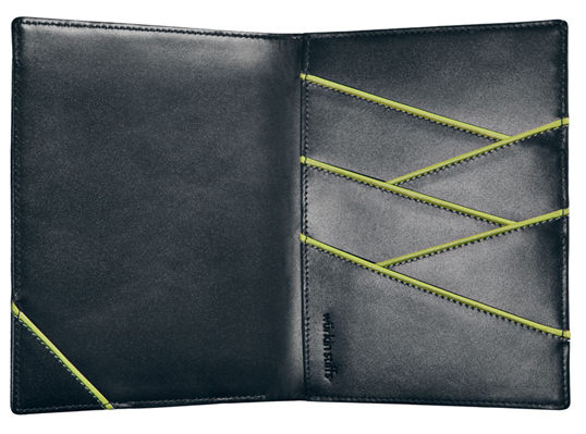 кошельке для паспорта, который так-же сделан из телячьей кожи, в ярких сочетаниях тонов иотделениями для денег и кредитных карт.