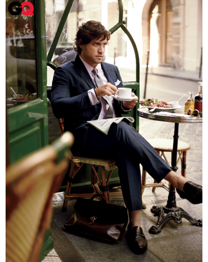 Костюм сдержанного синего цвета, рубашка вновь выглядывает из-под манжет, а белоснежный платок педантично сложен в переднем кармане. Ступням, при этом, будет гораздо комфортнее в кожаных винтажных туфлях, обутых на босую ногу.