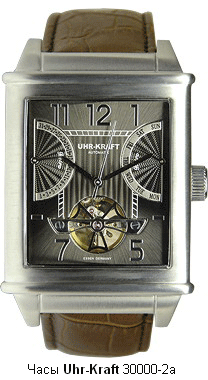30000-2А, они входят в коллекцию Time Square и даже имеют свой девиз, гласящий «Время — деньги». Такие часы можно надеть и с деловой одеждой, и с одеждой другого стиля. Корпус этих часов имеет прямоугольную форму и выполнен из стали. Большой размер, а точнее 35×49 × 14мм, включает не только часовой механизм, но и автоподзавод, который целый день не дает расслабиться пружине. Этот механизм размещен под стеклом на оборотной стороне часов и дополняет обычный механизм ручного завода. Обычно такое сочетание встречается у дорогих представительских марок.