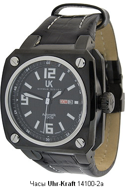 14100-2A. Стальной черный корпус выглядит массивно, он имеет вид модуля, в котором находится механизм автозавода, дополненный возможностью ручного завода, и две двухмиллиметровые пластины. Эти пластины плотно обхватывают модуль и закреплены при помощи винтов, которые можно регулировать самостоятельно. При регулировке можно изменять демпфирующие качества пластины, которая послужит противоударным барьером. Циферблат выполнен из материала, используемого при производстве болидов Формулы-1, карбона. Этот дорогой материал имеет показатели прочности выше, чем сталь, но массу легче, так как сделан он на основе углерода. На циферблате вы увидите большие маркеры времени, обладающие люминесцентными свойствами, и три стрелки, указывающие час, минуту, секунду. Кроме этого, на циферблате указана дата и день недели. Эти часы имеют повышенную водостойкость, благодаря задней крышке, имеющей прозрачное окошко. Один из положительных факторов этой модели — надежный браслет из черной лакированной кожи. Он выполнен из высококачественного материала, прошит и имеет повышенную прочность. Застежка типа «бабочка» надежно скрепляет браслет и расстегивается при нажатии двух кнопок.