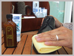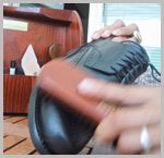 Нанесите на обувь гуталин специальной маленькой щеткой, как правило, округлой формы, сделанной из волос хвоста лошади. Так же можно использовать жидкие средства по уходу за обувью. Безусловно, цветгуталина должен быть в тон полируемой обуви. Чтобы убедиться в правильности выбранного цвета – нанесите небольшое количество крема на менее заметную область обуви и отполируйте ее.